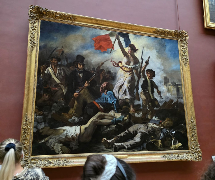 들라크루아의 민중을 이끄는 자유의 여신. 커다란 그림 곳곳에는 프랑스 국기의 모티프가 산적해 있다. 이 사람들에게 예술과 혁명은 무엇일까 생각한다