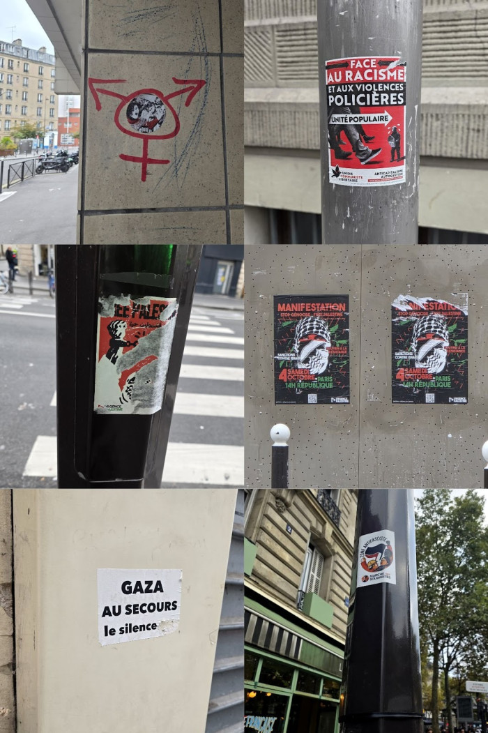 13일 오후에야 혼자가 되어 런던행 유로스타가 있는 10구의 파리 북역 근처 도미토리로 이동했다. 이전 일정에서도 가끔 경찰에 대한 반감이나 팔레스타인에 대한 연대를 표시하는 그래피티나 스티커를 보긴 했지만, 스탈린그라드 역(스탈린그라드 전투의 전승을 기리는 의미라고 한다)에서 내려서 도미토리로, 또 거기에서 북역이며 생드니의 무역노조 사무실 등을 오가는 이 하루 저녁 동안에는 그동안 봤던 것과는 비교할 수 없는 양의 좌파적 색채의 포스터나 연대의 슬로건을 볼 수 있었다.