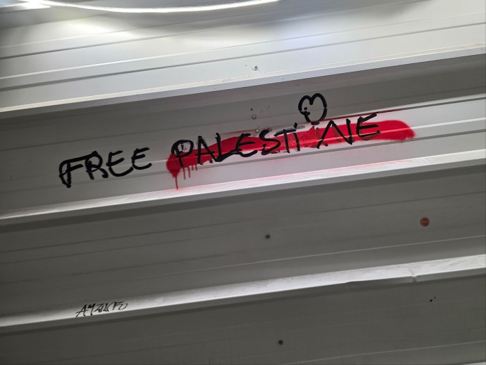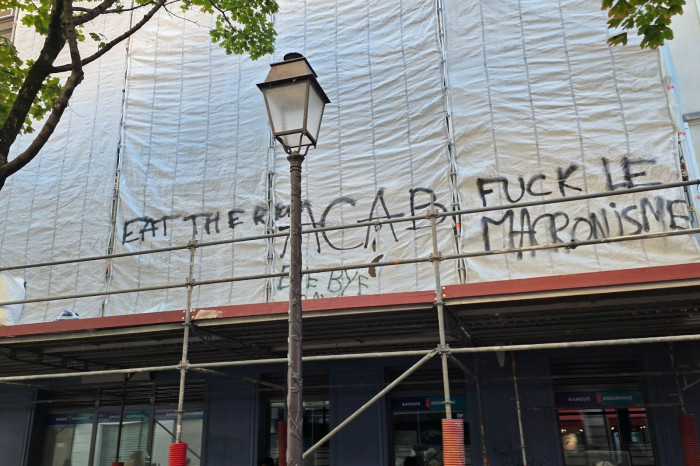 파리 3구 인근에서 찍은 사진. FREE PALESTINE(팔레스타인에 자유를), EAT The Rich(부자를 잡아먹자), ACAB(모든 경찰은 후레자식이다), Fuck le macronisme(마크롱주의 엿먹어라) 같은 낙서들이 눈에 띈다.