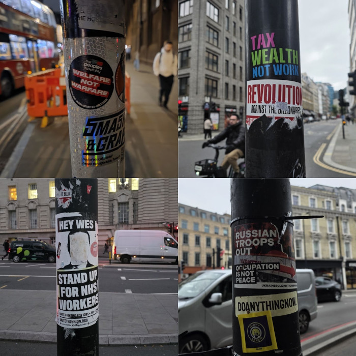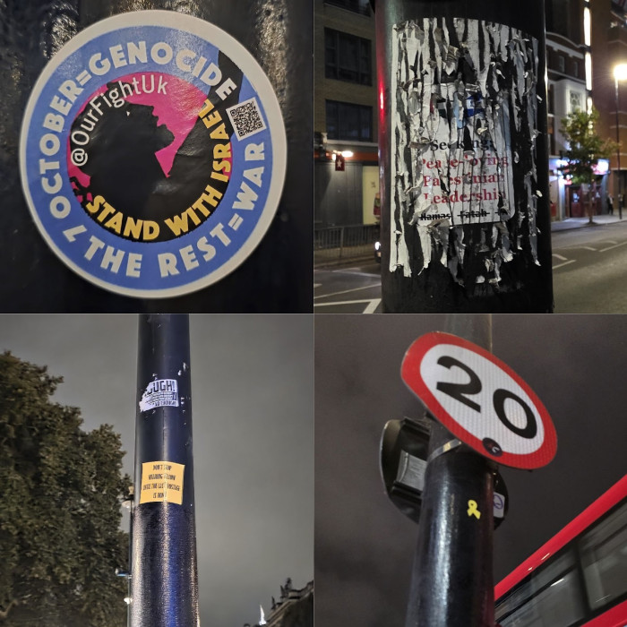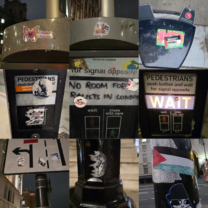 족히 20여 종은 될 팔레스타인 연대의 스티커와 곳곳에 보이는 공산당의 선전물. 동시에 그중 절반 이상은 뜯겨나가거나 덧칠되거나 다른 스티커로 덮혀 있었고, 방문한 나라들 중 이스라엘 측을 대변하는 메시지 또한 가장 구체적이고 다양했다. 래쉬와 백래쉬 모두 강하고 그 사이에서 충돌이 발생하는, 국지적으로 퍼져나가는 장과 장이 거리 곳곳에서 부딪히는 이미지를 떠올리며 '영국 정부가 시위대를 보호하지 않는다'라는 문장이 반영하는 이 도시의 정세를 상상해본다.