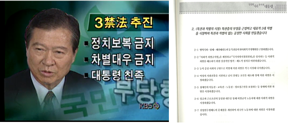 ▲ (좌) 「3금 법안」의 추진을 발표하는 김대중 새정치국민회의 총재 (새정치국민회의 김대중 총재, 정치보복-차별대우 금지법 제정 선언, 1997년도 9월 10일 KBS.) (우) 16대 대통령선거 핵심 공약 / 4대비전 20대 기본정책 150대 핵심 과제 - 당당한 대한민국 떳떳한 노무현 속 사회적 차별금지법 언급 페이지. 노무현 사료관.)